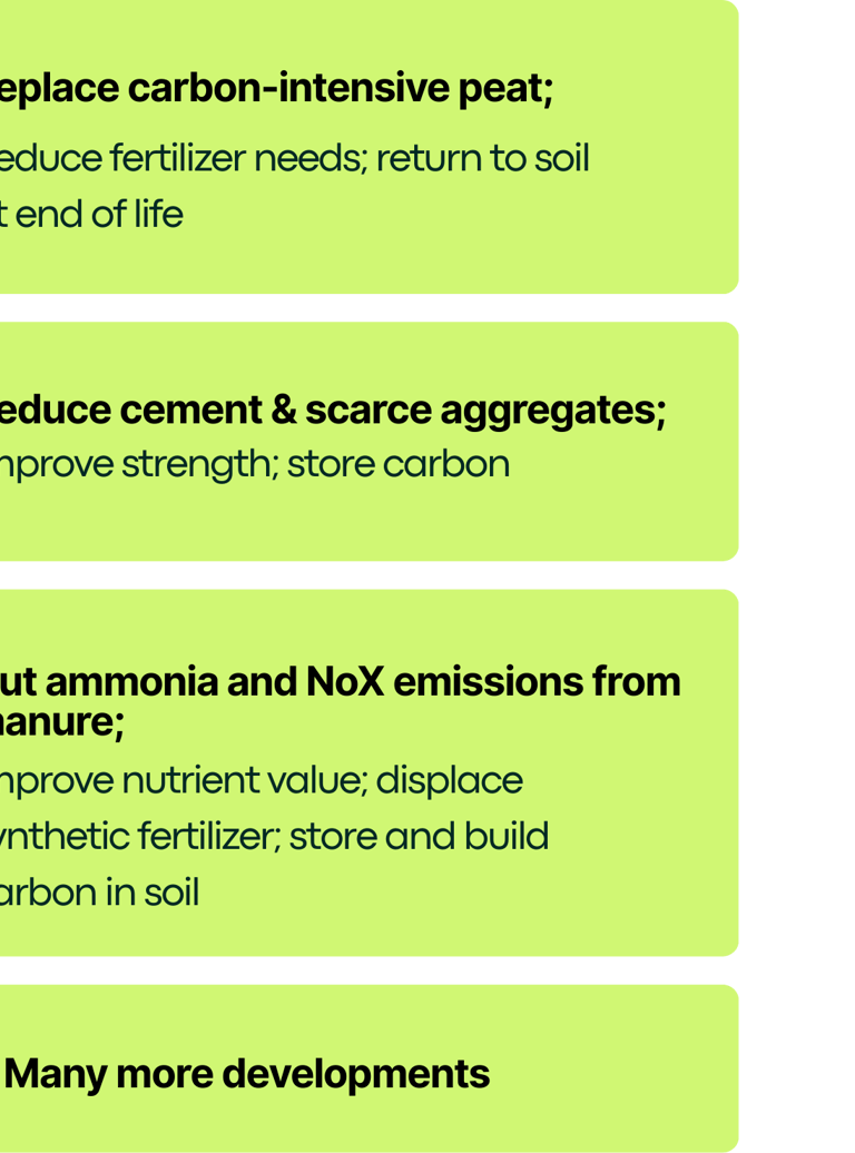 By transforming biochar into useful materials for ag and industry, every atom of carbon makes already makes an impact while its on its way to permanent storage.
